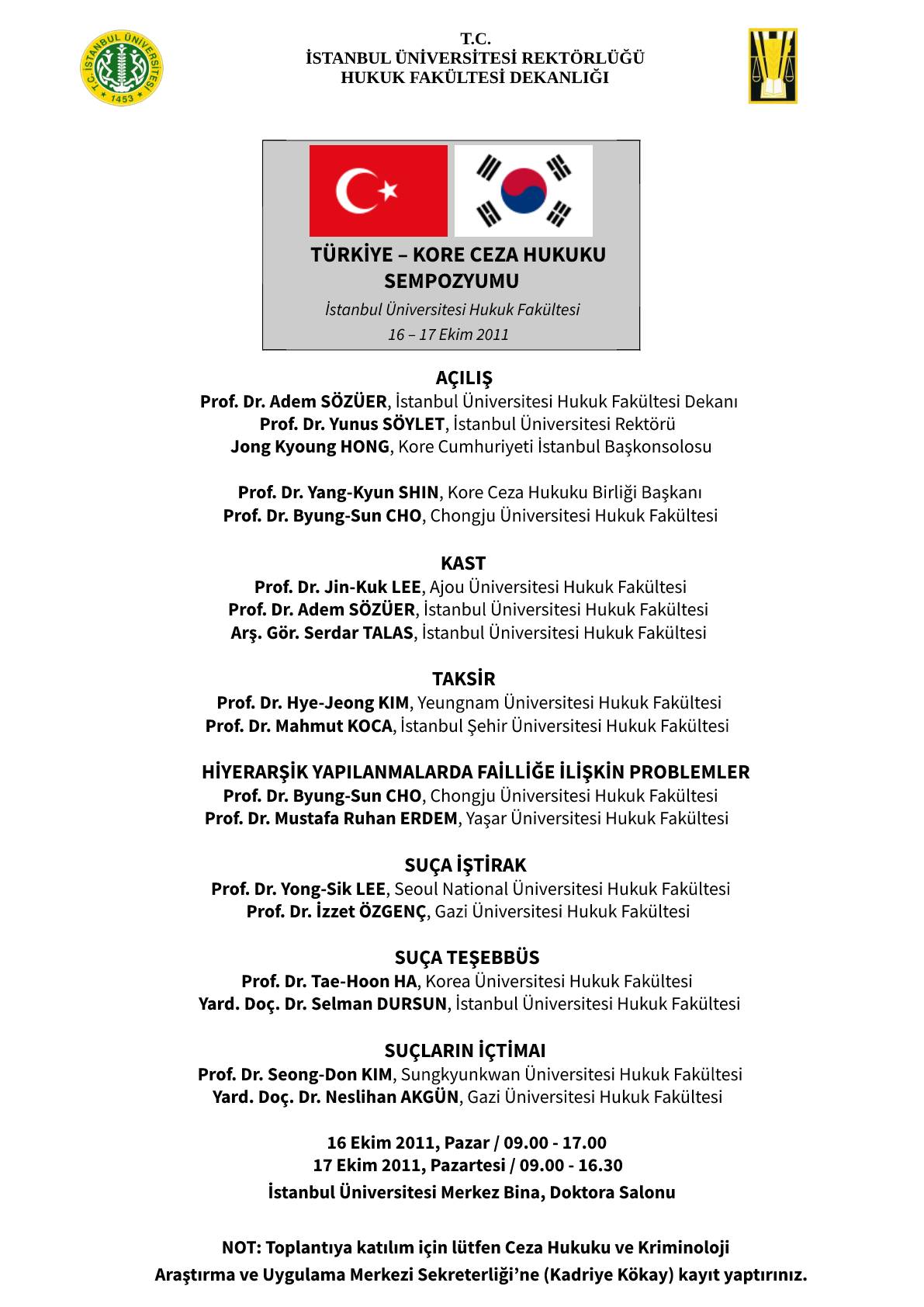 1. Türk- Kore Ceza Hukuku Sempozyumu, İstanbul Üniversitesi Hukuk Fakültesi ev sahipliğinde 16-17 Ekim 2011 tarihlerinde gerçekleştirilmiştir. Sempozyumun ana teması “ceza hukukunun temel ilkeleri” olup kast, taksir, teşebbüs iştirak gibi temel konularda sunumlar yapılmıştır. Açılış konuşmaları ise, İstanbul Üniversitesi Rektörü Yunus SÖYLET ve Güney Kore Cumhuriyeti İstanbul Başkonsolosu Jong Kyoung HONG tarafından yapılmıştır.